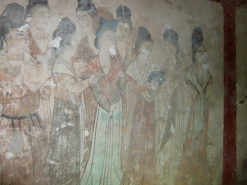 乾陵周辺には、高官やその近親者の墓が多く、なかでも則天武后の怒りに触れ、17歳の若さで没した悲運の少女、4代中宗の第七女、永泰公主の墓があります。現在乾陵博物館となっています。墓の中には、色鮮やかな女官の壁画が描かれています。永泰公主の壁画は、奈良の松塚壁画のモデルといわれています。中宗は則天武后の死後、洛陽にあった娘の墓を乾陵の近くのこの地に移し葬りました。墓は1960年に発掘。墓道の壁画は現在陝西歴史博物館に保管されています。(墓道内部にある壁画は1970年の復元です。)